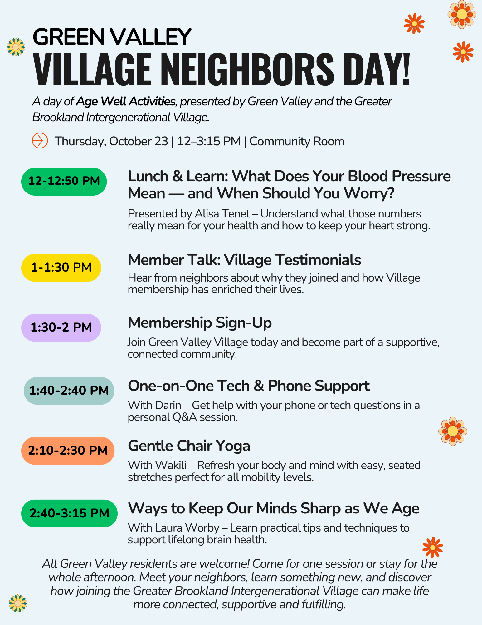 Join us for a day of Age Well Activities created in partnership between Greater Brookland Intergenerational Village and Green Valley Senior Apartments. Come for one session or stay for the whole afternoon — meet your neighbors, learn something new, and discover how connection supports healthy aging and joyful living.
