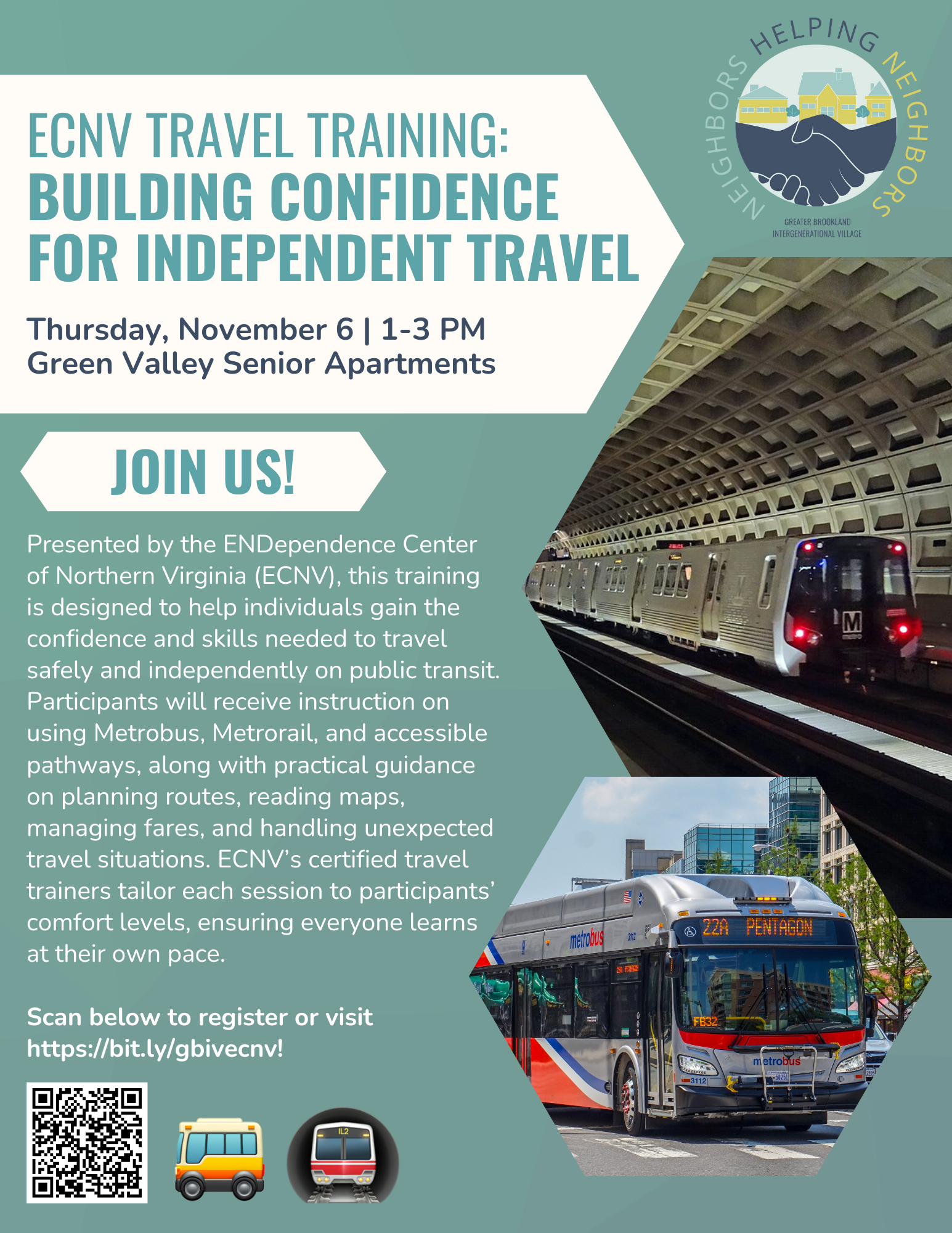 Presented by the ENDependence Center of Northern Virginia (ECNV), this training is designed to help individuals—especially older adults and people with disabilities—gain the confidence and skills needed to travel safely and independently on public transit. Participants will receive instruction on using Metrobus, Metrorail, and accessible pathways, along with practical guidance on planning routes, reading maps, managing fares, and handling unexpected travel situations. Personalized hands-on support is available as needed. ECNV’s certified travel trainers tailor each session to participants’ comfort levels, ensuring everyone learns at their own pace in a supportive environment.