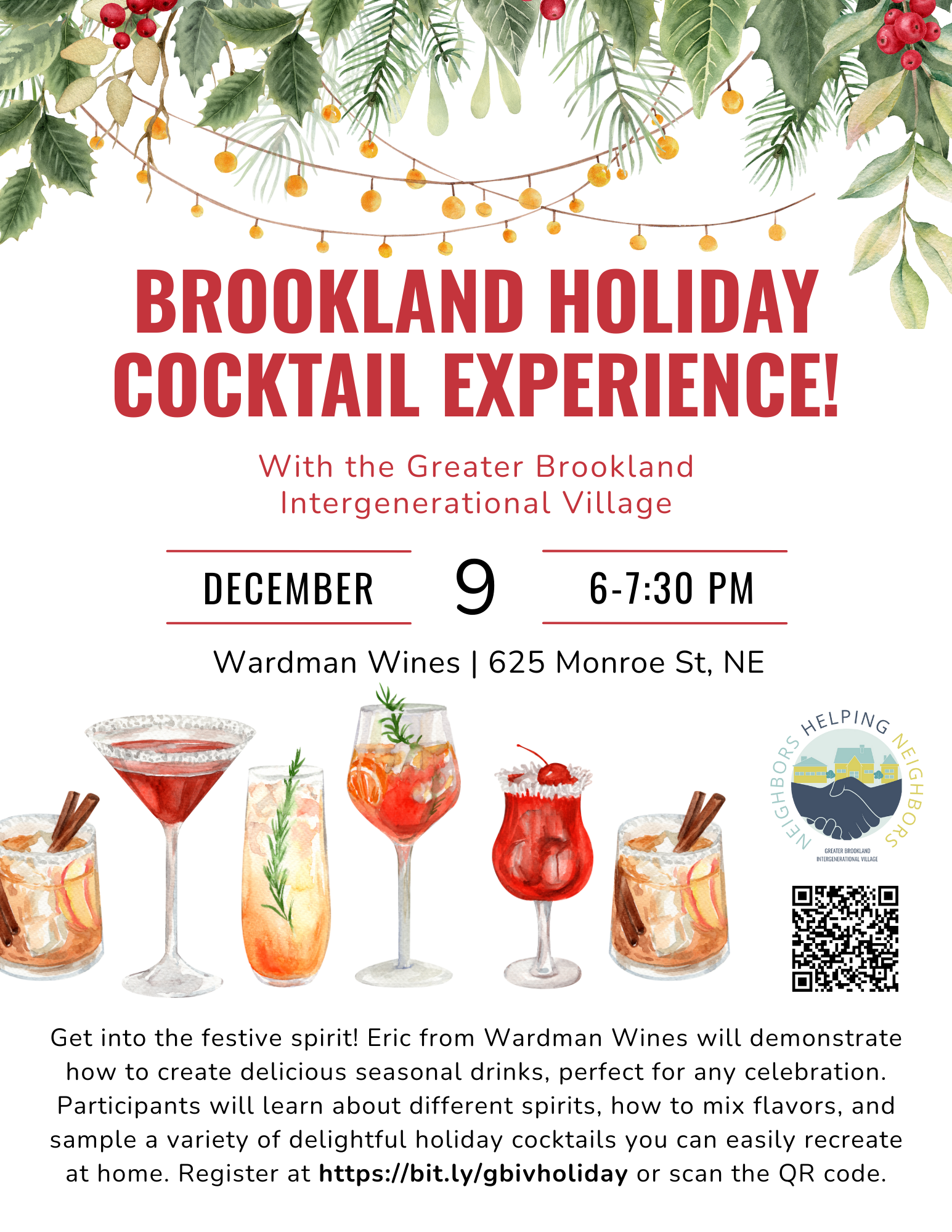 Cheers to the Holidays! Get into the festive spirit with a Brookland Holiday Cocktail Experience! Our talented friend Eric from Wardman Wines will demonstrate and discuss how to create delicious seasonal drinks that are perfect for any celebration. Participants will learn about different spirits, how to mix flavors that shine together, and best of all sample a variety of delightful holiday cocktails you can easily recreate at home.