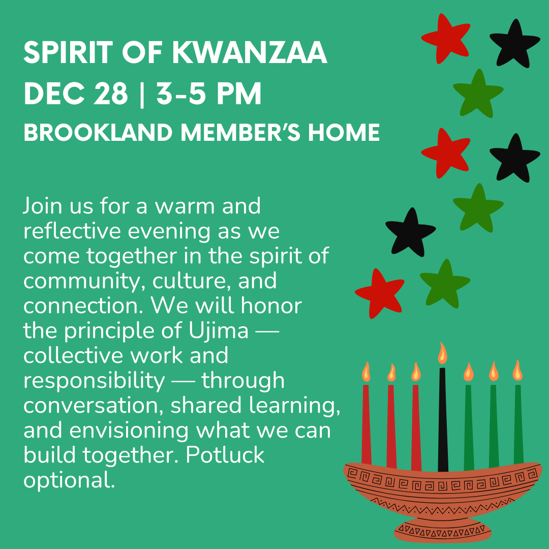 Join us for a warm and reflective evening as we come together in the spirit of community, culture, and connection. We will honor the principle of Ujima — collective work and responsibility — through conversation, shared learning, and a moment to envision what we can build together. Light refreshments and thoughtful engagement await as we celebrate the richness and meaning of Kwanzaa with one another. Potluck optional - feel free to bring a dish, drink, or snack.