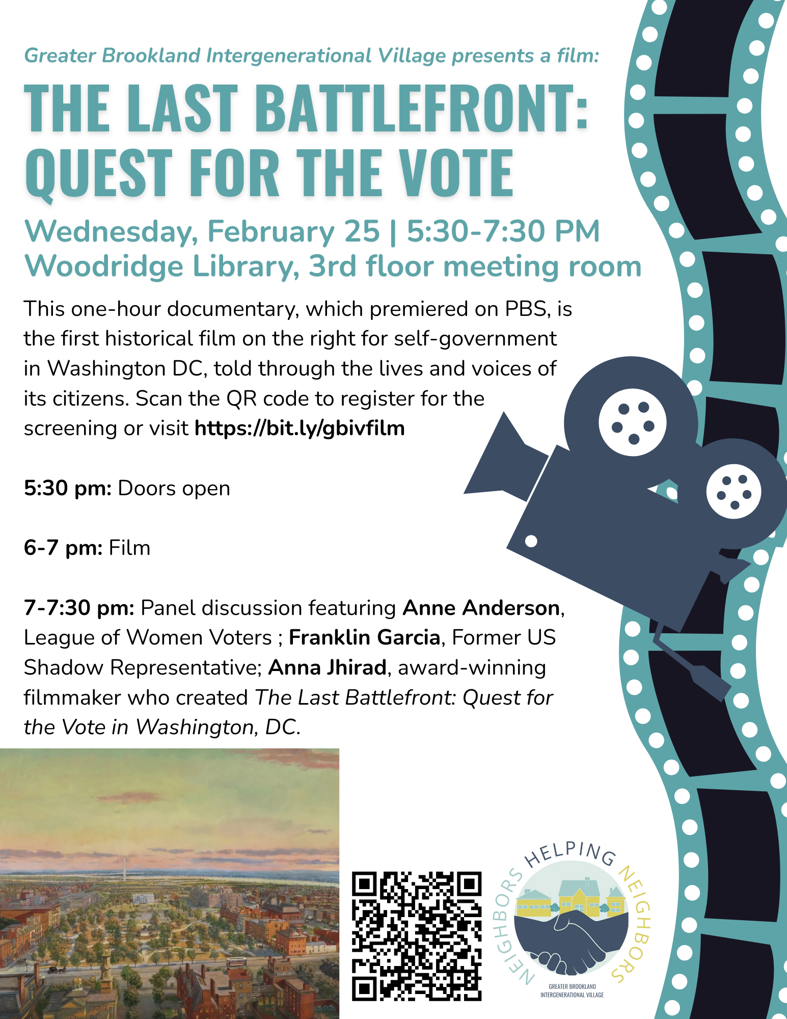 7:00-7:30 pm Panel discussion featuring Anne Anderson, League of Women Voters ; Franklin Garcia, Former US Shadow Representative; Anna Jhirad, award-winning filmmaker who created The Last Battlefront: Quest for the Vote in Washington, DC.