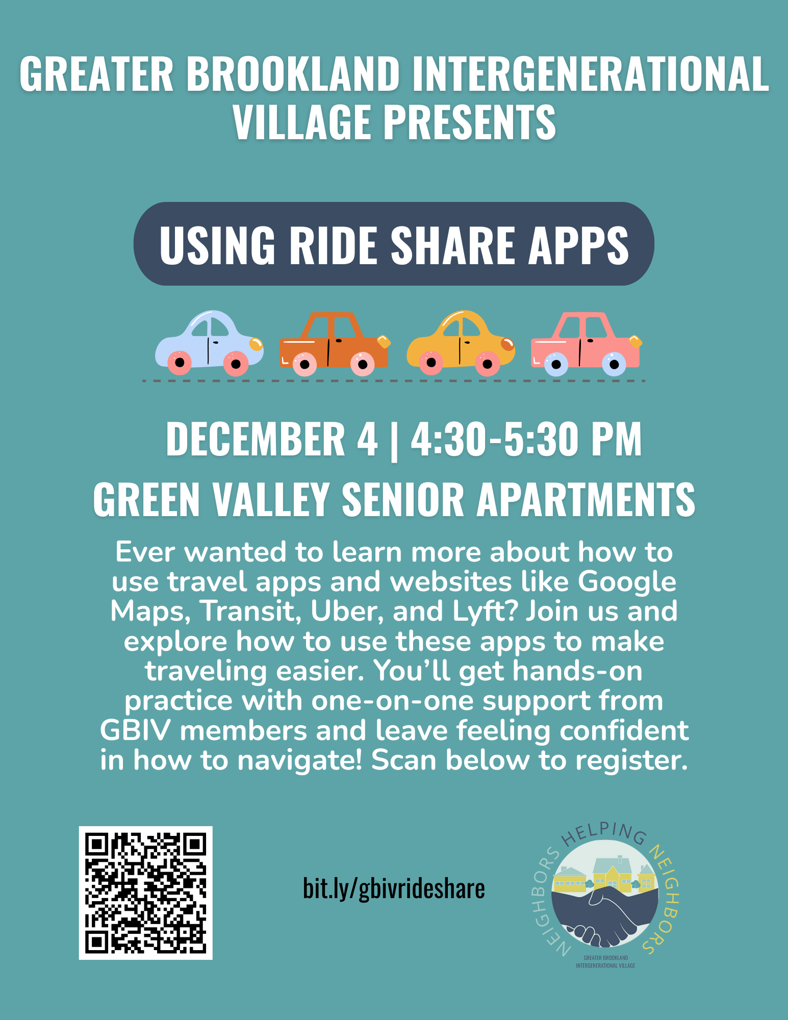 Have you ever wanted to learn more about how to use travel apps and websites like Google Maps, Transit, Uber, Lyft, and more? Join us for an interactive event at Green Valley Senior Apartments, where we’ll explore how to use these apps to make traveling locally easier—whether you’re at home in DC or visiting another city. You’ll get hands-on practice with one-on-one support from GBIV members and leave feeling confident in how to navigate!